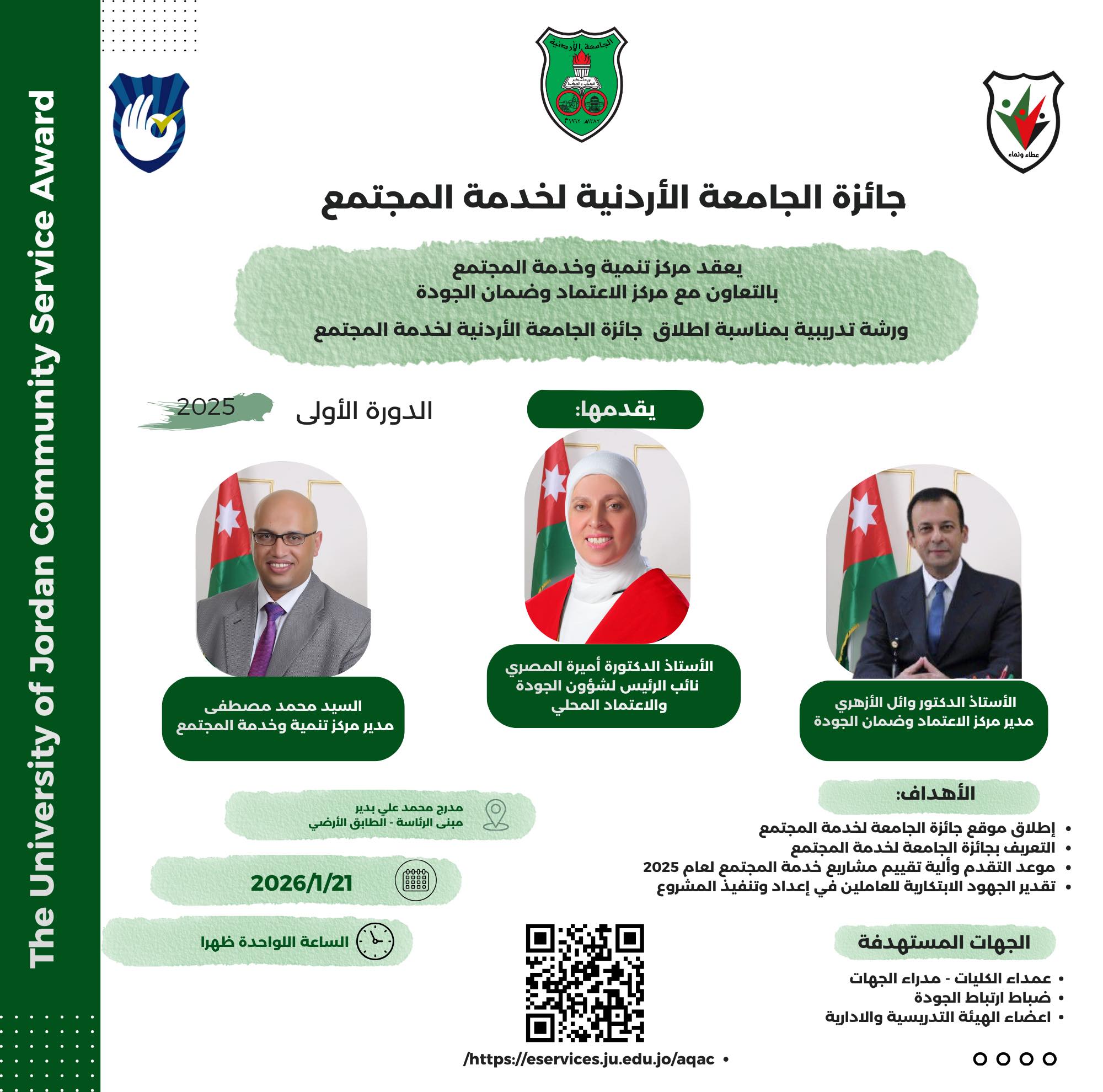 الجامعة الاردنية تعقد ورشة تدريبيه عن جائزتها في خدمة المجتمع
